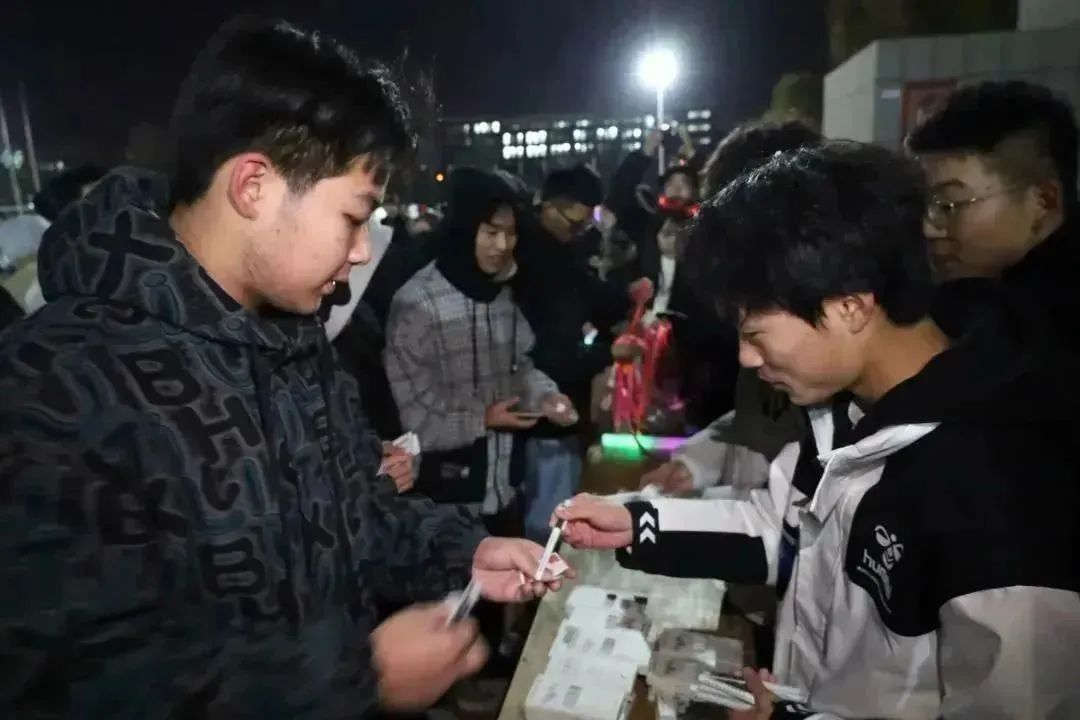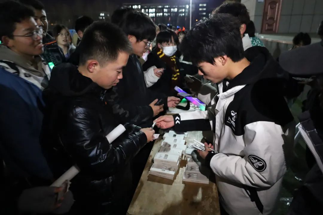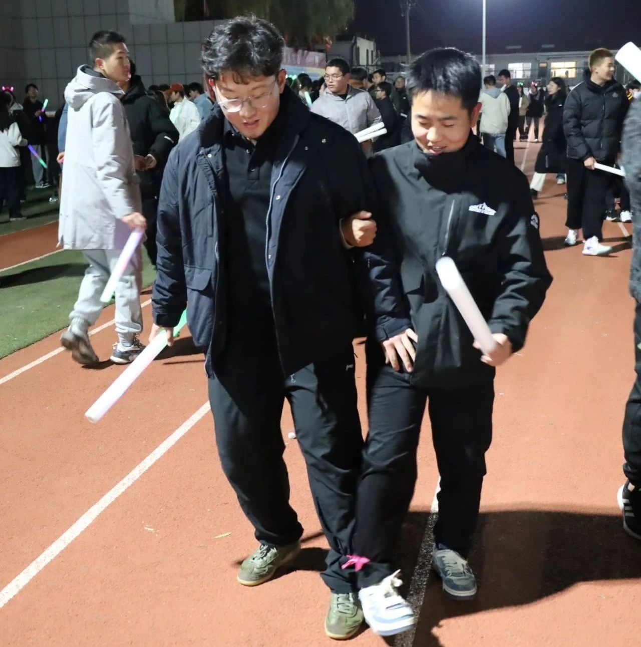 活动开始前,同学们在田径场指定位置集合、整队,由工作人员为他们进行现场签到和发放活动道具荧光手环,并由各领队带领同学们进行400米的夜跑热身活动。本次活动分为三组,每组按照规定的时间间隔从田径场出发,开始荧光夜跑活动。夜色与荧光碰撞,同学们以青春的蓬勃朝气驱散黑夜的沉寂,鲜活地展现榆苑学子意气风发、气宇轩昂的精神风貌。