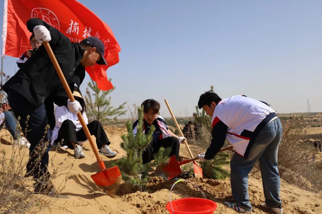 植树现场,公司师生齐心协力,分工明确,默契配合,从挥锹铲土、到培土围堰,再到扶直苗木、提水浇灌每道工序有条不紊地进行着,呈现出一派热火朝天的劳动景象。大家亲手播种下对绿色生活的美好祝福祝愿,共同绘出绿色榆林的靓丽底色。