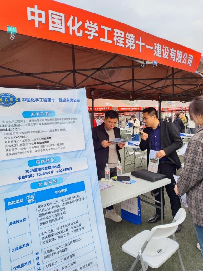3月15日,公司老师深入招聘会现场,围绕岗位需求、薪资待遇、职业发展空间、企业文化等关心的问题和招聘单位负责人进行交流,为毕业生寻找专业对口的工作,向企业大力推介公司毕业生。在中煤榆林分公司、内蒙古灵圣作物科技有限公司、中国化学工程第十一建设有限公司、胜利油田大明集团有限公司的招聘点,白锦军老师向用人单位介绍了公司特色专业设置情况和人才培养情况,希望用人单位吸纳更多优秀员工参与到公司的发展,为毕业生提供更多的就业机会。