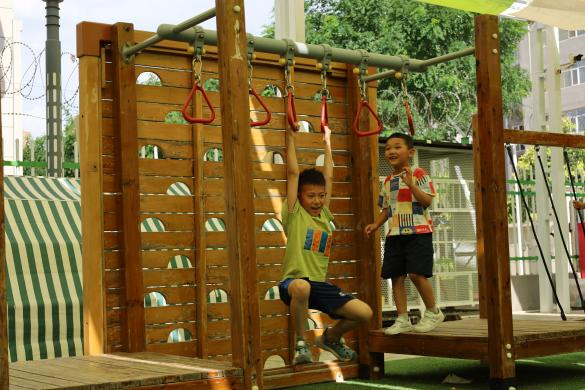 热身完毕后,李苏鹍与黄文贤根据孩子们的年龄特点和身体状况,安排了多样化的体育活动。孩子们参与了躺床秋千,吊椅秋千,吊单杠,独木桥,首先映入眼帘的是色彩斑斓的躺床秋千和吊椅秋千,它们在空中轻轻摇曳,仿佛在向孩子们招手。孩子们兴奋地排好队,轮流体验这些新奇的设施。在秋千上,他们或躺或坐,感受着风从耳边掠过的快感,不时发出阵阵欢笑声。