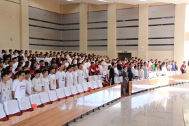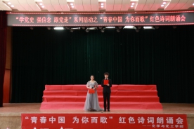 “我志愿加入中国共产主义青年团,坚决拥护中国共产党的领导......”全体共青团员面向团旗郑重进行入团宣誓。比赛正式开始,选手们以铿锵有力的气势、高昂的斗志诵读了红色经典,表达了对党的热爱与敬畏。中场环节,王英,王珂同学倾情献唱歌曲《奔跑》,杨劲升同学进行了个人朗诵表演《我骄傲,我是中国人》。比赛后,在场人员更是将其对党的热爱融进了“没有共产党就没有新中国”的嘹亮歌声中。