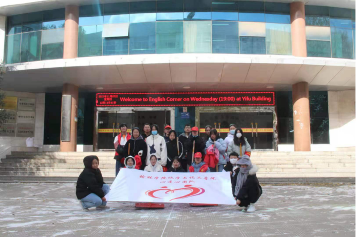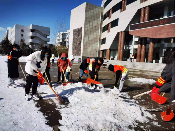 厚重的积雪给清理工作带来了很大的麻烦,室外温度更是低至零下五度,但是志愿者们的热情丝毫不减,经过一个半小时的努力,终于将图书馆前的积雪清理干净,消除了积雪带来的安全隐患,为同学们的进出带来方便。