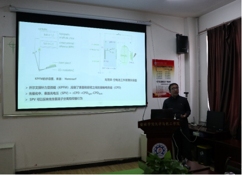 交流会上,姜超然博士结合自身研究兴趣和近期研究进展介绍了多种原位表征技术在光电催化领域的应用,包括原位XAFS研究电催化OER反应的活性物种、原位XPS、EPR、UV-Vis研究光催化暗态产氢机理以及开尔文探针力显微镜原位成像研究空穴-电荷分离情况等。报告结束后,姜超然博士与会场老师和硕士研究生进行了热烈的学术讨论,并耐心回答了相关学术问题。