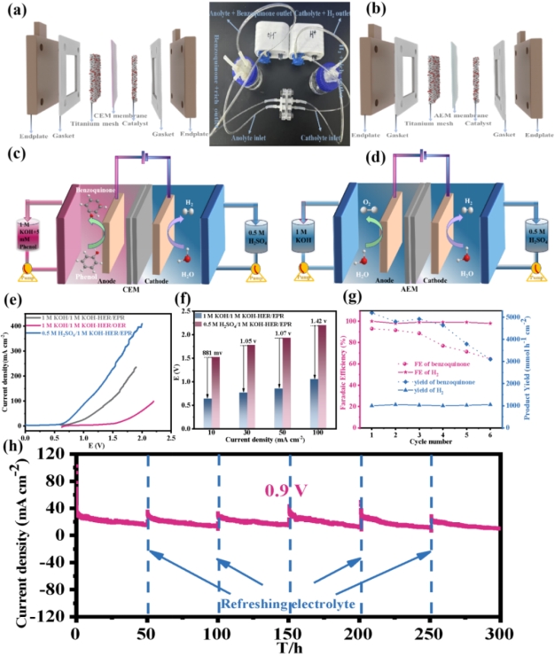 图3.Ni9S8-Ni15O16/NF || RuIr/Ti的电化学性能。(a)混合酸/碱电解池极板结构图和(b)传统碱性电解池极板结构图;(c)混合酸/碱电解池结构图和(d)传统碱性电解槽;(e)不同pH条件下HER-EOP和HER-OER的LSV曲线;(f)混合酸/碱电解池和传统碱性电解池在不同电流密度下的EOP-HER外加电压的比较;(g)在50小时的循环实验中,混合酸/碱电解池生产苯醌和氢气的法拉第效率和产率;(h)Ni9S8-Ni15O16/NF在0.9 V电压下的长期稳定性测试。
