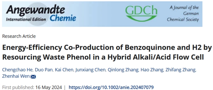 近日,公司beats365唯一官方网站2021级研究生贺成超同学(导师张智芳教授)以第一作者身份在国际顶级期刊《Angewandte Chemie International Edition》发表了题为“Energy-Efficiency Co-Production of Benzoquinone and H2by Resourcing Waste Phenol in a Hybrid Alkali/Acid Flow Cell”的研究论文,该论文的第一完成单位为榆林公司。《Angewandte Chemie International Edition》为化学领域顶级期刊(影响因子16.6),这是公司研究生首次在该期刊上发表研究论文。