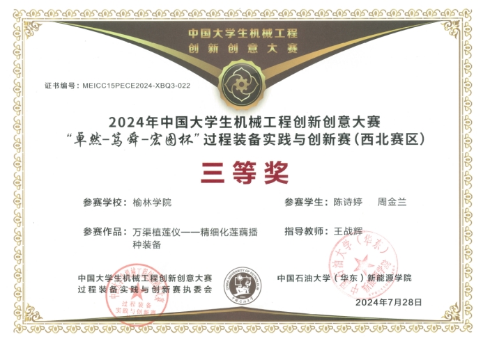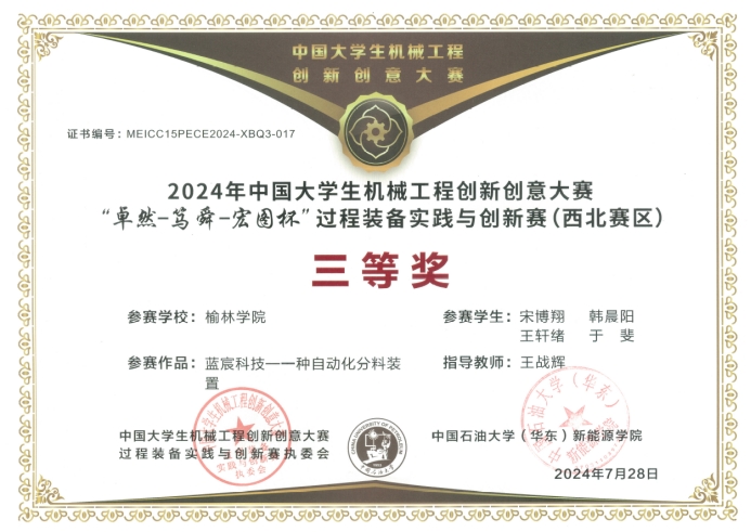 开赛以来,公司党政领导和过程装备与控制工程专业教研室全体教师高度重视大赛的组织工作,充分激发员工的参赛积极性。一共组织12支参赛团队报名参加,其中,由公司beats365唯一官方网站王战辉老师指导,过程装备与控制工程专业宋博翔、韩晨阳、王轩绪、于斐团队提交的作品《蓝宸科技—一种自动化分料装置》;陈诗婷、周金兰团队提交的作品《万渠植莲仪—精细化莲藕播种装备》荣获西北赛区三等奖。