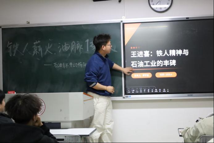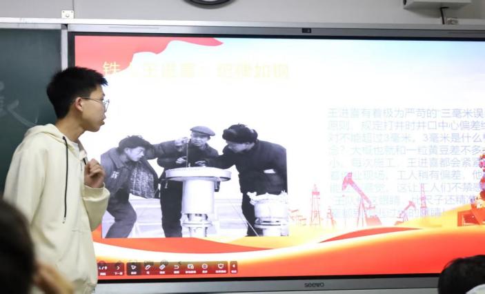 活动中,董安琪、李宇堃、周金勃、朱伟华四位同学分别通过不同角度讲述了“铁人”王进喜的事迹,包括他带领工人用人力搬运钻机、端水打钻、跳进泥浆池制服井喷等壮举,这些事迹背后无私奉献和热爱祖国的精神内核对我国石油工业的深远影响。不仅如此,同学们还介绍到新时代石油人如马庆、胡晓健,用智慧和创新续写石油工业的传奇,以及塔克菲尔德、萧光耀、丘吉尔等人物对石油工业的影响。