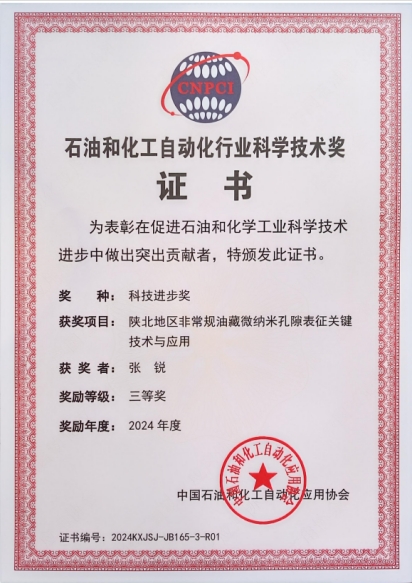 4月20日,2024 年度中国石油和化工自动化行业科学技术奖与专利奖颁奖大会在浙江省杭州市召开,由石油工程系张锐正高级工程师为第一完成人申报的“陕北地区非常规油藏微纳米孔隙表征关键技术与应用”项目荣获科技进步三等奖。该成果由榆林公司联合延长油田股份有限公司勘探开发技术研究中心、西北大学、中国石油天然气股份有限公司长庆油田分公司第一采油厂等3家单位联合完成,团队成员包括石油工程系王伟博士、梁正中教授、白云云副教授、李亚辉博士等8人。