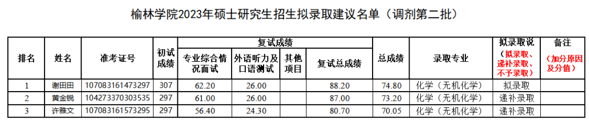 根据《榆林公司beats365唯一官方网站2023年硕士研究生招生复试录取工作方案》,公司于4月16日以线上的形式对第二批次调剂考生进行了复试。现将参加复试考生的基本信息、初试成绩、复试各项成绩、总成绩及公司“建议录取”结果予以公示: