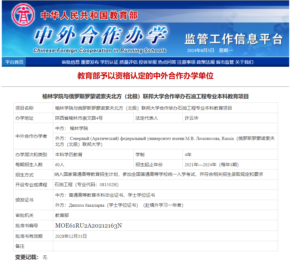 榆林公司与俄罗斯罗蒙诺索夫北方(北极)联邦大学大学合作举办石油工程专业本科教育项目于2021年4月获教育部批准,批准书编号:MOE61RU2A20212163N。2021年9月项目开始招生,本项目拟在省内外计划招收石油工程专业(中外合作办学)本科生60人。