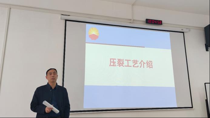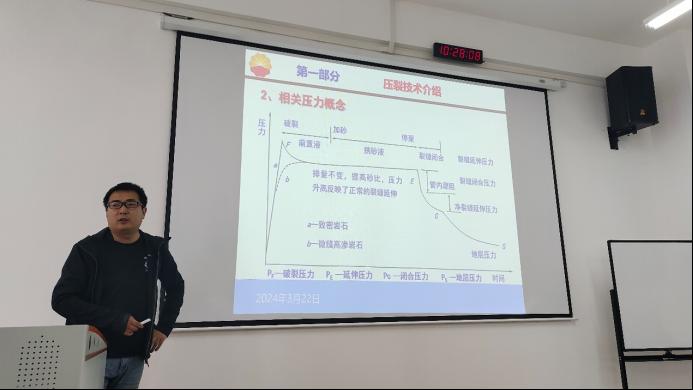 张皓宇博士就本次赛题基础数据为选手进行了深入细致的讲解,重点介绍了压裂工艺设计流程及难点进行了全面细致的讲解;他还就团队协作及汇报答辩给出了自己的建议,建议组内成员加强交流、明确分工又相互合作,撰写报告时要做到有理有据,制作PPT时要多采用图表,汇报答辩时要注重精神风貌。