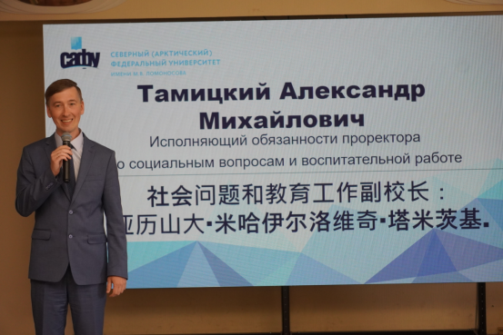 北方(北极)联邦大学负责社会问题与教学工作的副董事长亚历山大·米哈伊尔洛维奇·塔米茨基和同学们交流
