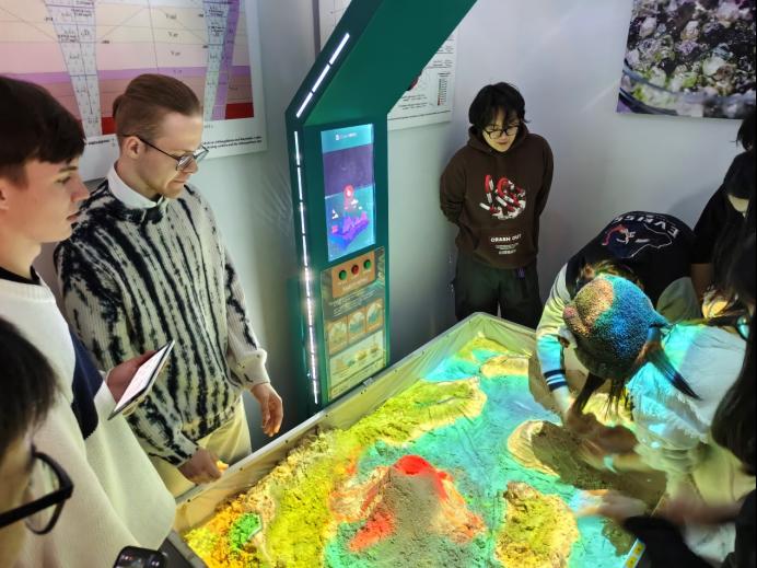 在实验室区域,员工们触摸了各种岩石标本,观看了不同种类岩石碎屑在显微镜下的形态,同时利用沙盘模拟设备模拟了各种地形地貌并进行了分析。