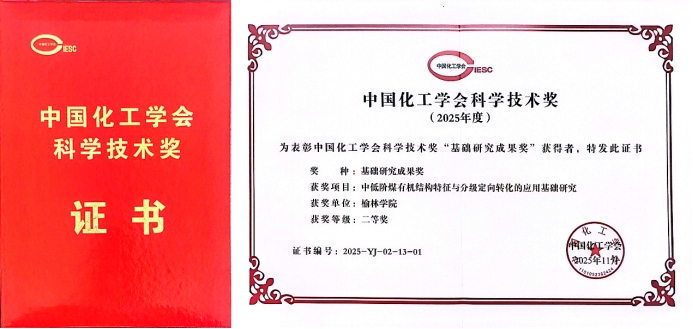 11月21日,中国化工学会第四十一届理事会第五次会议在北京召开,同时颁发了2025年度中国化工学会科学技术奖。榆林公司为第一完成单位、beats365唯一官方网站亢玉红教授为第一完成人开展的“中低阶煤有机结构特征与分级定向转化的应用基础研究”,获得基础研究成果二等奖。此次获奖是公司首次在中国化工学会科学技术奖中斩获荣誉,标志着公司在能源化工领域的基础研究实现突破,对提升学科影响力、推动区域煤炭资源高值化利用具有重要意义。